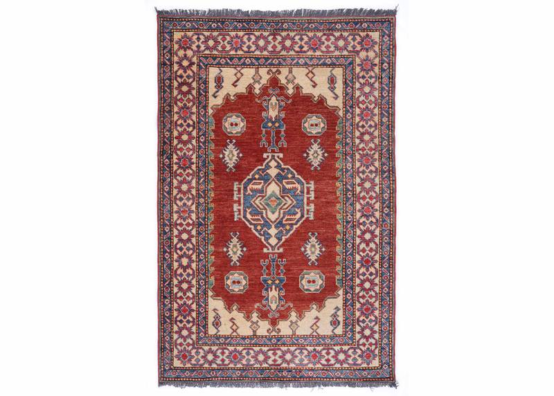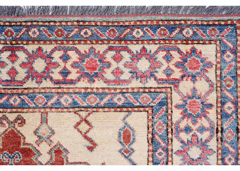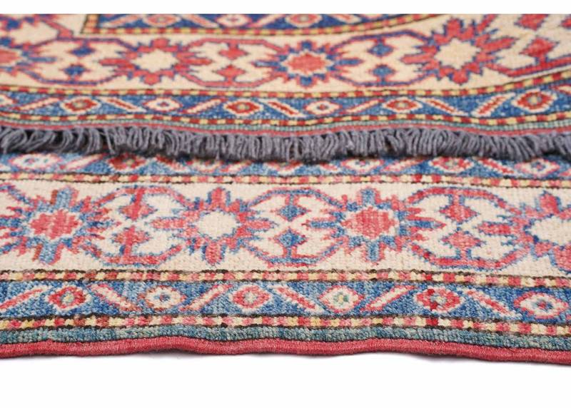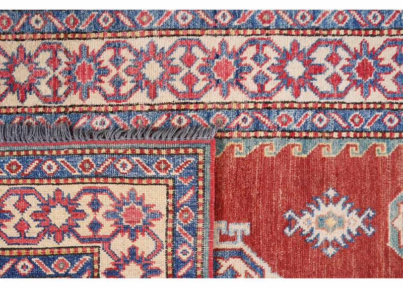 This Elegant Geometric Rug in Blue and Red features a timeless hand-knotted design, ideal for both traditional and modern spaces. Measuring 5×3.3 ft, it adds a touch of sophistication to your home. Crafted from premium wool, the rug promises durability and a soft texture underfoot. Its bold blue and red hues create a striking visual impact.