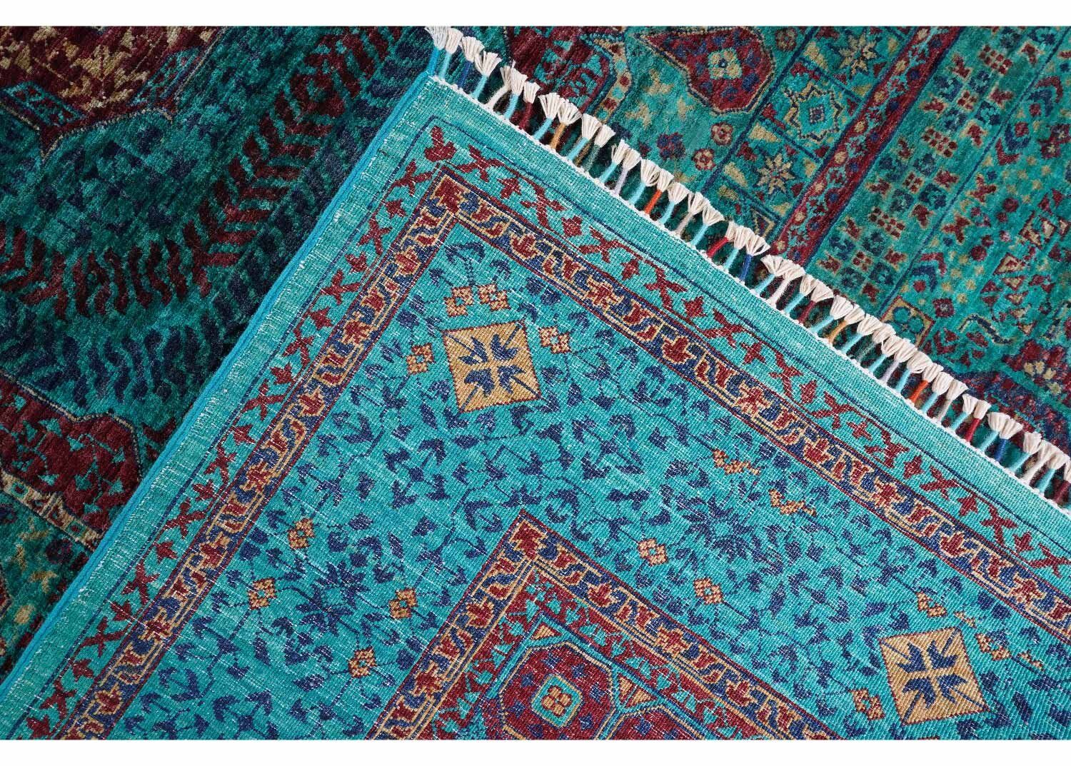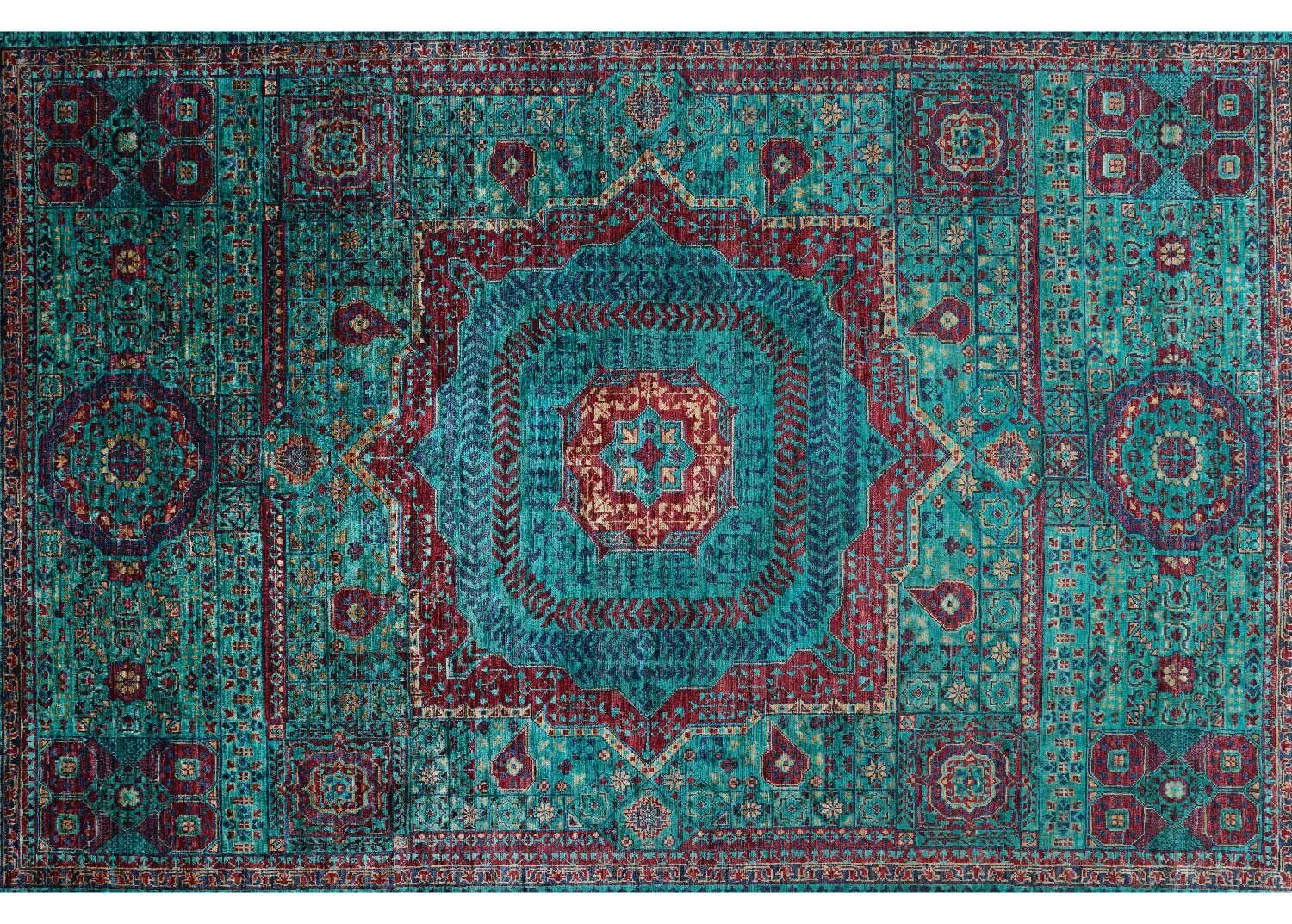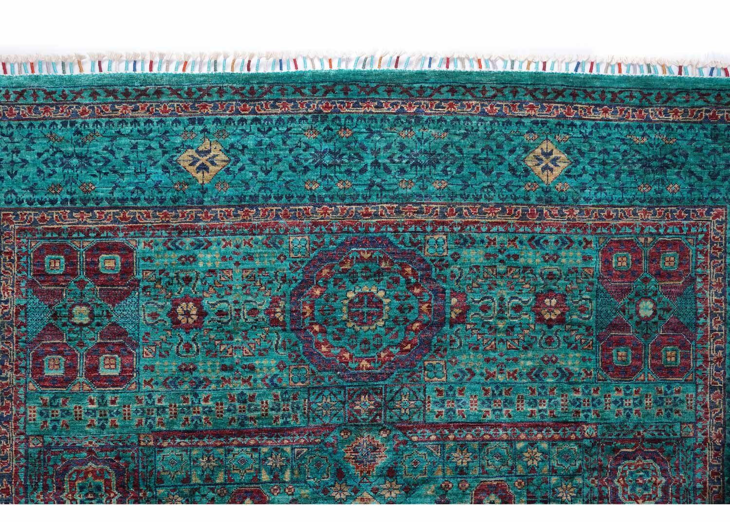 This Exclusive Green Area Rug showcases a classic Mamluk design that blends tradition with elegance. Crafted from 100% natural wool, its hand-knotted structure ensures durability and a timeless charm. The rich green shades, accented with intricate geometric patterns, elevate any space, making it ideal for living rooms or bedrooms.