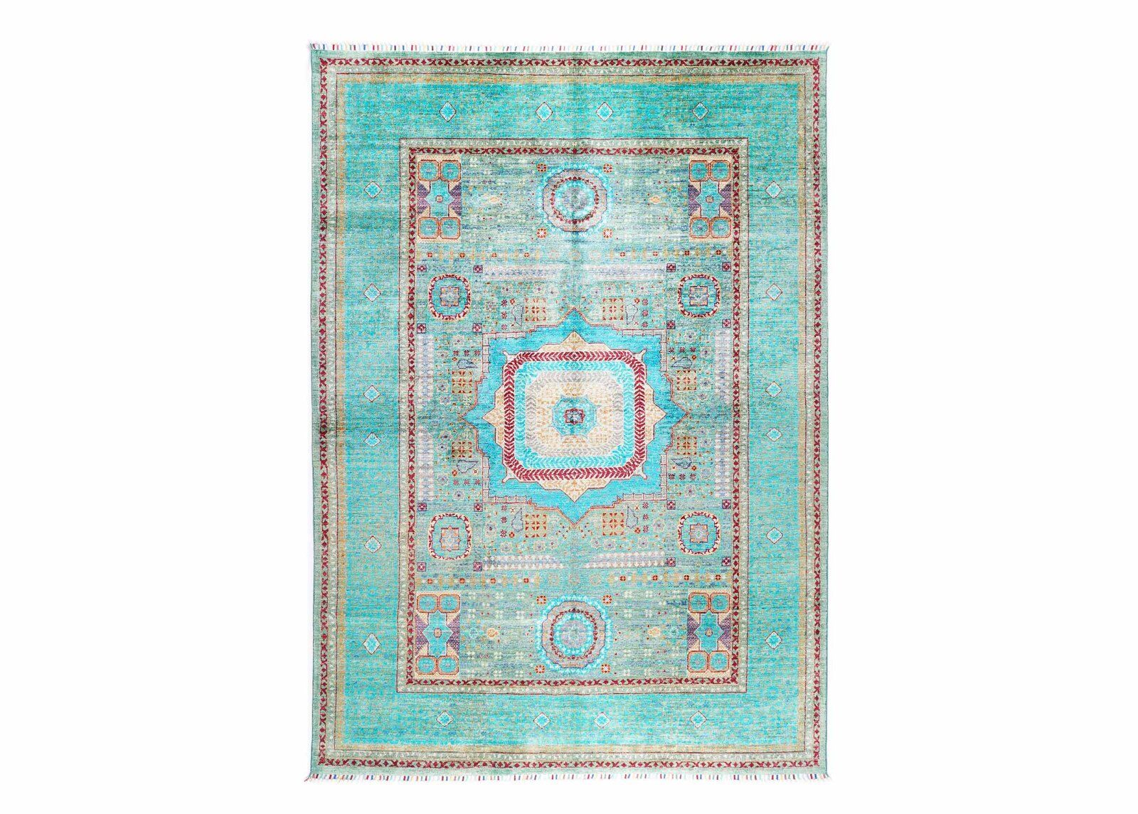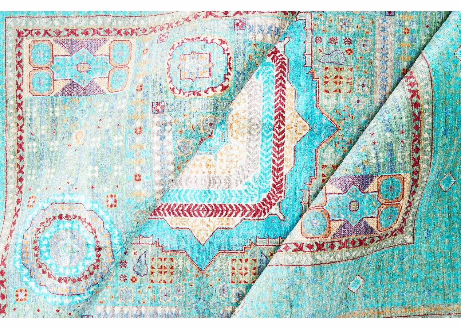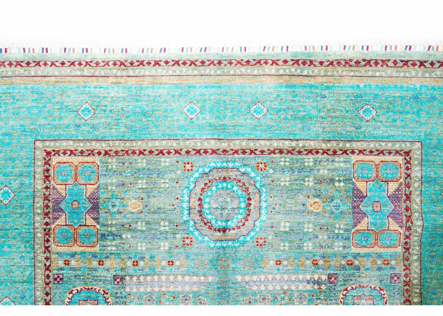 Elevate your space with the Handknotted Memluk Traditional Rug in Green and Blue Geometric Pattern, measuring 8.1×5.7 ft. This exquisite rug blends timeless design with vibrant colors. Handcrafted with precision, it showcases intricate geometric patterns that add a touch of elegance to any room. The wool material ensures durability and softness, while the handknotted craftsmanship provides a unique, artisanal quality.
